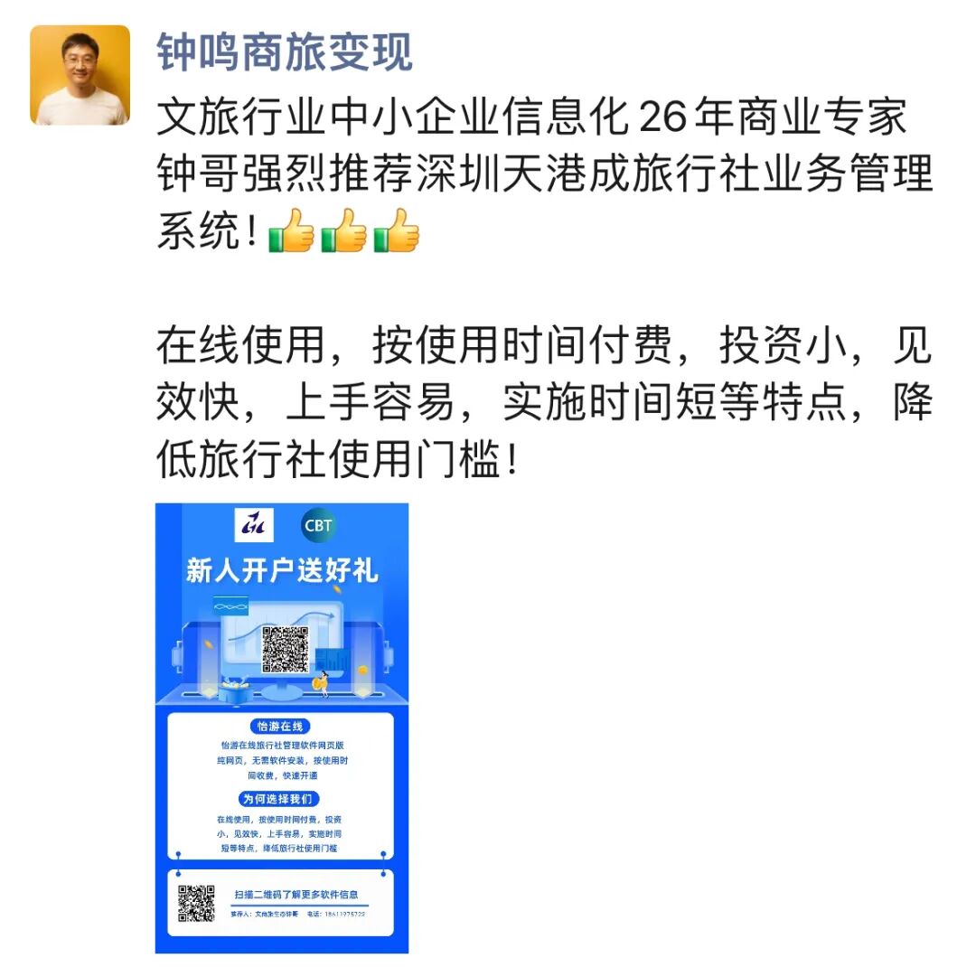 文旅行业中小企业信息化26年商业专家钟哥强烈推荐深圳天港成旅行社业务管理系统!