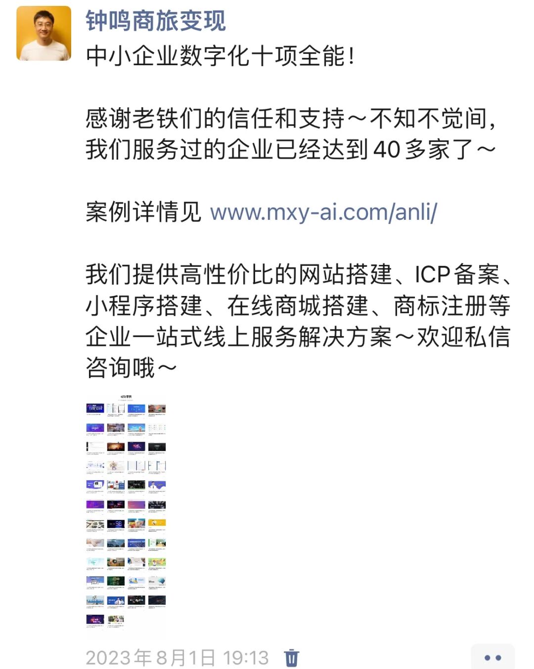 我们提供高性价比的网站搭建、ICP备案、小程序搭建、在线商城搭建、商标注册等企业一站式线上服务解决方案~欢迎私信咨询哦~