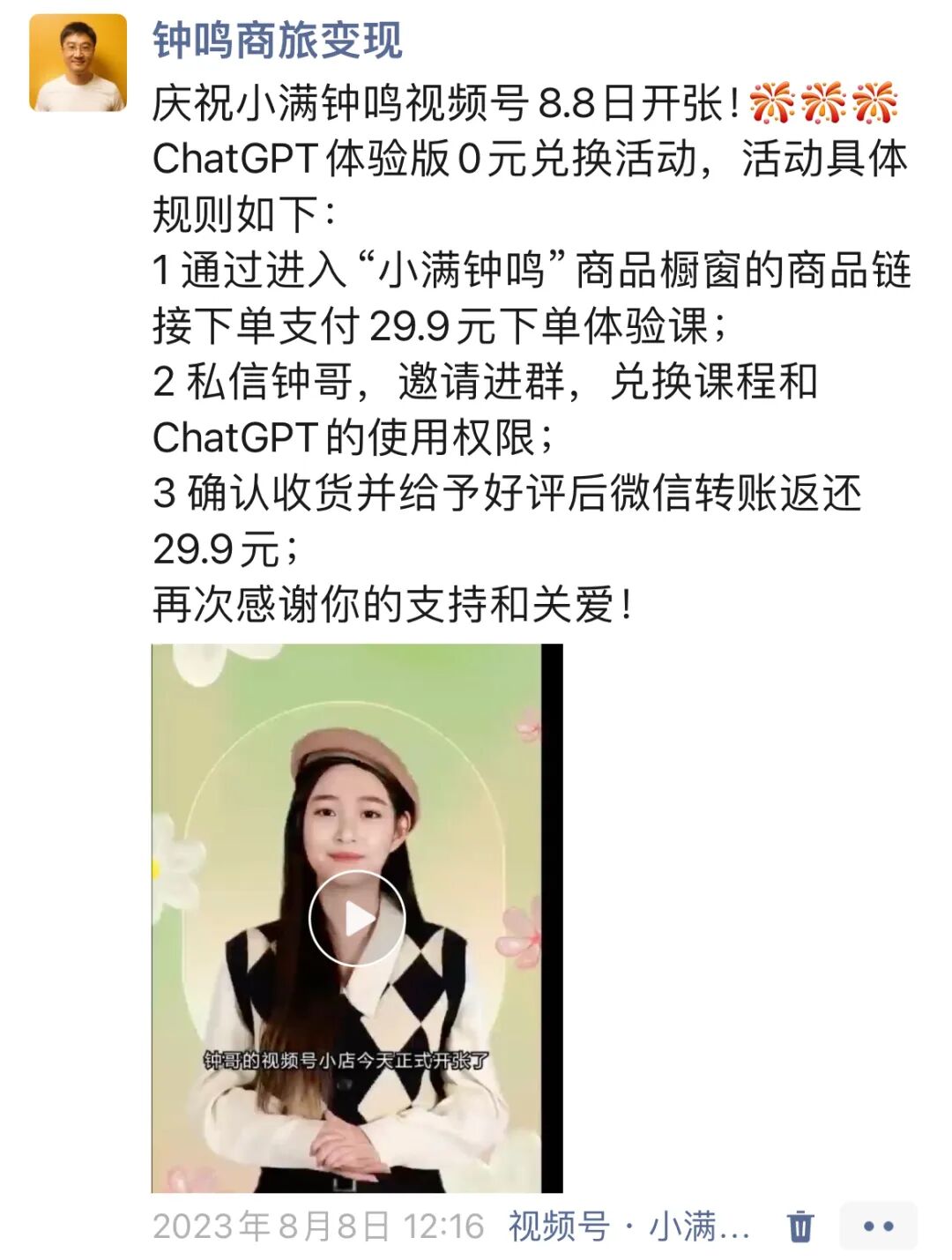 庆祝小满钟鸣视频号8.8日开张!