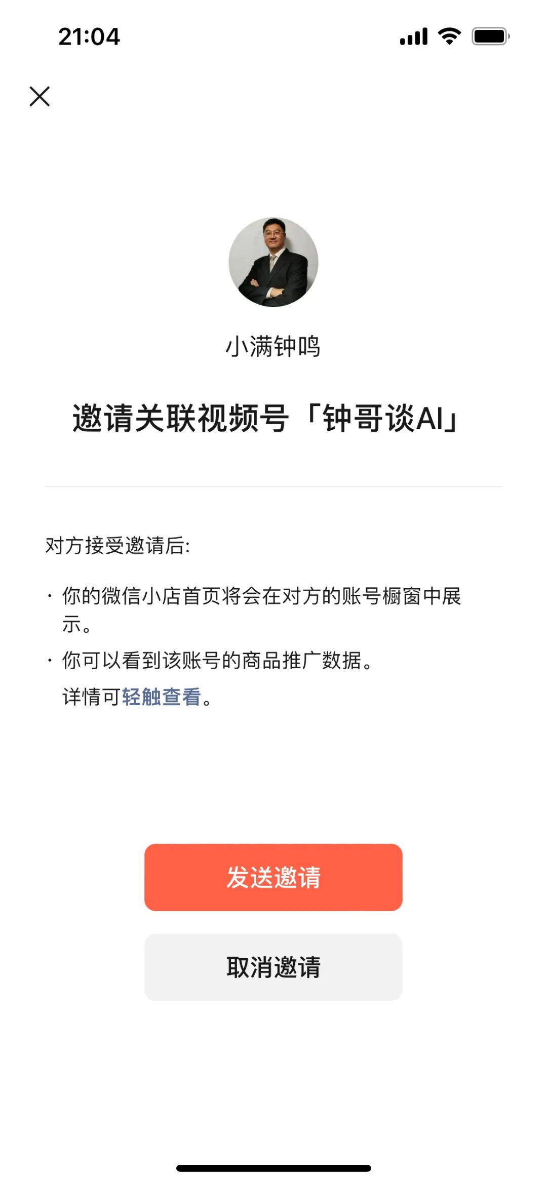 5 微信小店支持关联账号,这些账号可以是个人也可以是企业,只需要邀请后对方同意就可以,需要注意的是同意需要切换到商家自营模式,一个视频号/ 公众号只能被一个微信小店关联