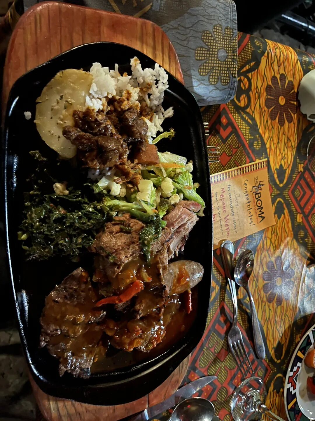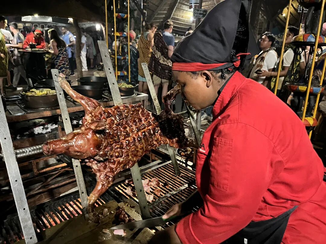 百兽宴特色餐,有美食,有歌舞表演,每人发一个非洲鼓,敲起来!